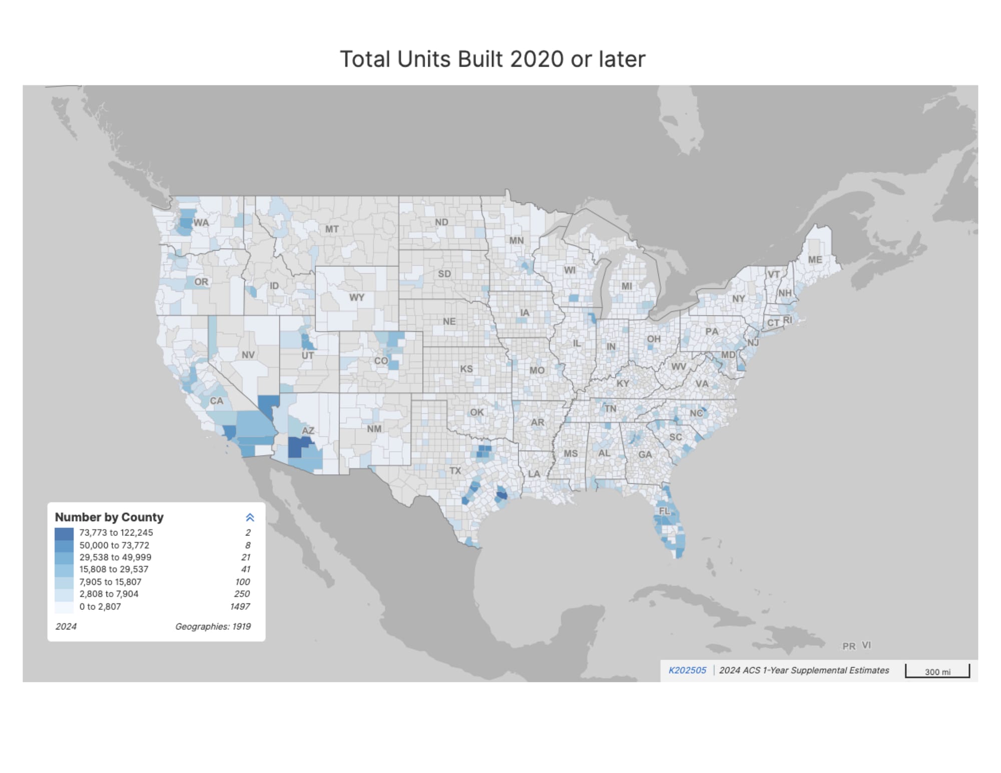 According to 2024 ACS estimates, only ten counties have produced over 50,000 housing units since 20204. While counties require various needs of housing supply due to their own individual population growth, the truth remains that housing supply has not kept on par with the growing demand.