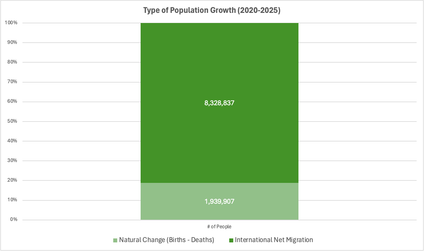 In addition to rents outpacing income growth, population growth has added further strain to housing affordability. Over the past five years (2020-2025), the United States has added more than 10 million residents. Of this increase, roughly 81% is attributable to net international migration, while only 19% stems from natural population change—births minus deaths2. While controlled immigration is generally a positive force for economic expansion, it would not be honest to ignore the short-term pressures and adjustment costs that accompany rapid demographic change, particularly in housing markets with already constrained supply.