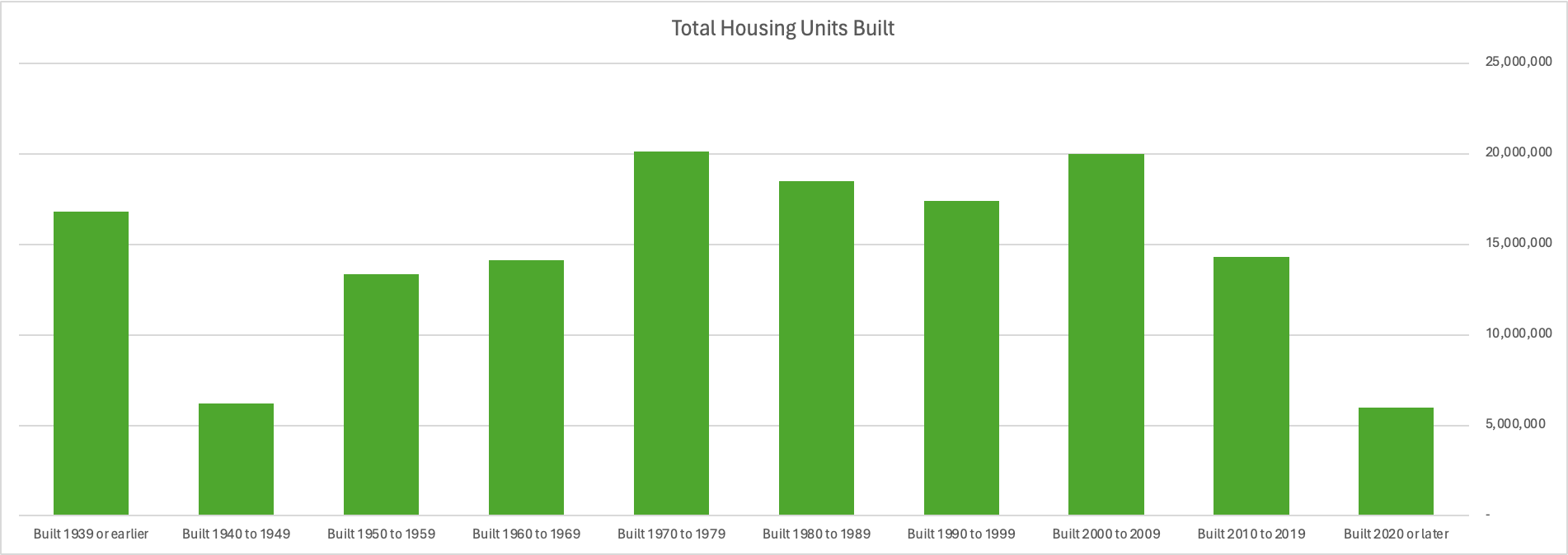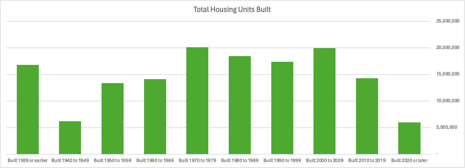 - U.S. Census Bureau. "Year Structure Built." American Community Survey, ACS 1-Year Estimates Detailed Tables, Table B25034, https://data.census.gov/table/ACSDT1Y2024.B25034?t=Year+Structure+Built&g=010XX00US. Accessed on 16 Feb 2026.